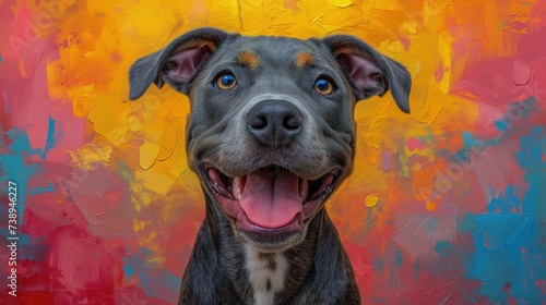 Na zdjęciu widać bliską fotografię szczęśliwego psa, którego paszcza jest otwarta, na tle kolorowej ściany