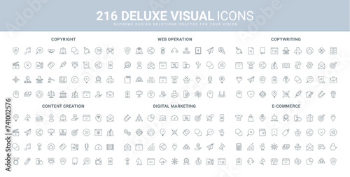 Digital marketing, ecommerce and web services, content creation line icons set. Creative articles and authors patent, copyright protection for storytelling thin black symbols vector illustration