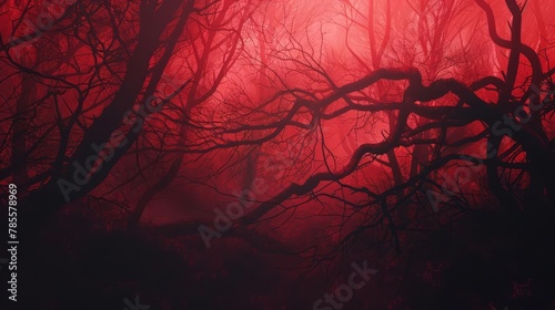 silhouette of twisted branches in red foggy forest eerie horror movie scene concept illustration
