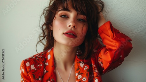 Indie sleaze style, woman in orange floral shirt, fashion lifestyle fashion model long hair elegance