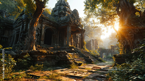 A Silent Ancient Ruined Temple in Forest Landscape Background