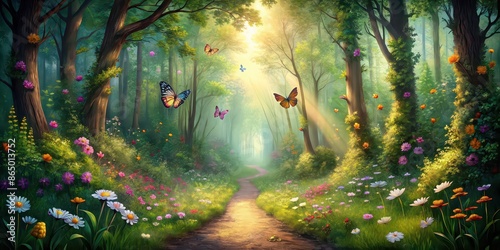 Fantasy scene of path through forest with flowers and butterflies, fantasy, forest, path, flowers, butterflies