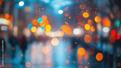 A blurry image of a city street with lights and people. Scene is busy and lively, with the bright lights and movement of people creating a sense of energy and excitement