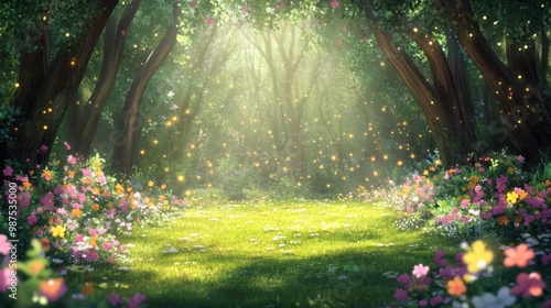 Enchanted forest clearing with glowing fireflies and blooming flowers.
