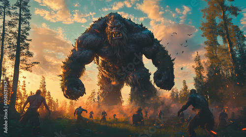 Against the background of dawn, a giant troll and people are fighting in a forest clearing. his body is covered with tattoos and scars. epic fantasy battle. Giant Troll. Illustration