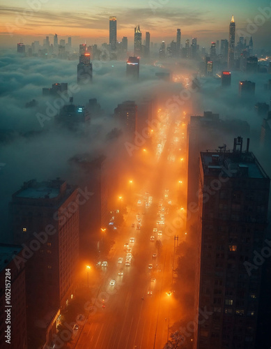 Miasto nocą, mgła, mglisty, światła, noc, wieczór, chmury, krajobraz, ponury