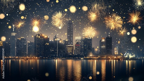 sylwester 2024/2025, sztuczne ognie, złote fajerwerki, noc sylwestrowa, celebracja nowego roku, ilustracja cyfrowa, ciemnoniebieskie tło, kieliszki do szampana, elegancja, miasto nocą, glamour, błyszc
