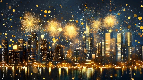sylwester 2024/2025, sztuczne ognie, złote fajerwerki, noc sylwestrowa, celebracja nowego roku, ilustracja cyfrowa, ciemnoniebieskie tło, kieliszki do szampana, elegancja, miasto nocą, glamour, błyszc