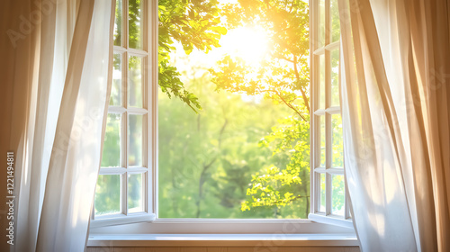 An open window with curtains swaying gently, inviting in sunlight and fresh air, symbolizing renewal