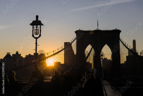 brooklyn bridge at sunrise (new york city landmark over east river to manhattan) travel tourism famous destination in usa america united states (suspension cables lamp light streetlight) people cross