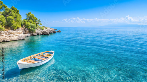 Serene cove with a lone boat, sunlit turquoise water and trees, idyllic vacation spot