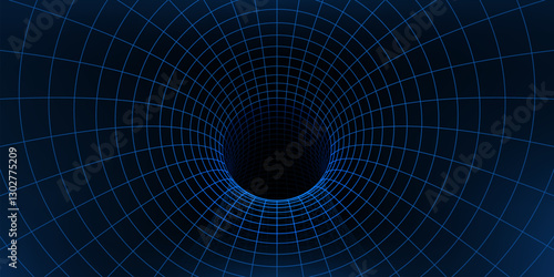 Wireframe grid tunnel vector 3d background. Abstract space wormhole, mesh tunnel, funnel or vortex with geometric grid pattern of neon blue line wireframe. Digital graphic space wormhole or portal