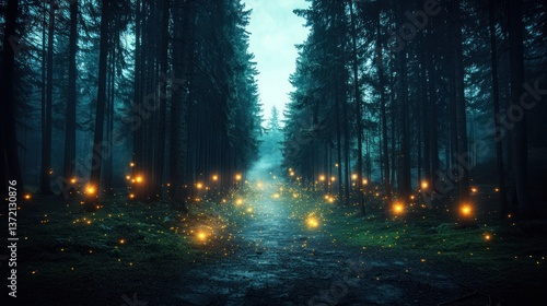Mystical forest path lit by fireflies