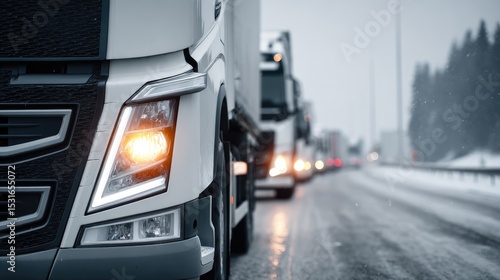 Fleet of Trucks on Icy Road: A convoy of semi-trucks navigates a snow-covered highway, the lead truck's headlights illuminating the treacherous path.