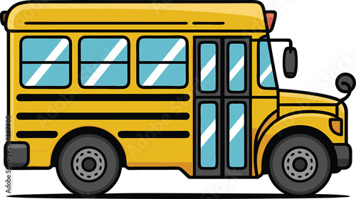 Cartoon illustration of a bright yellow school bus with big windows and open doors