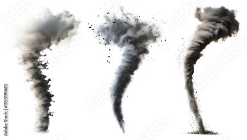 PNG Three swirling tornadoes in varying shapes and sizes element set on transparent background.