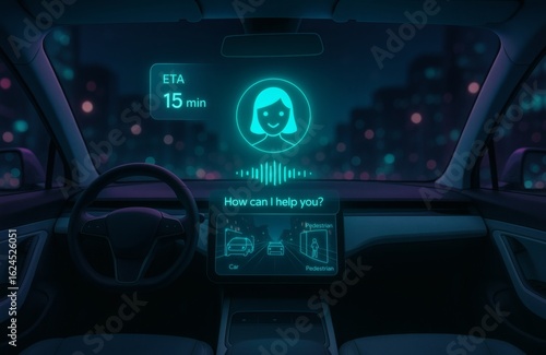 Futuristic Self Driving Car Interior with AI Assistant Hologram Display and Object Detection at Night in Cityscape