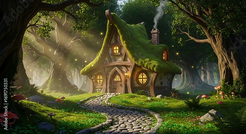 Enchanting Forest Home: Whimsical Cottage with Moss Roof and Cobblestone Path in a Magical Woodland Setting.