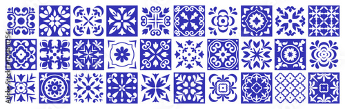 Geometric Azulejos tiles. Mediterranean Portuguese, Italian or Spanish retro old blue mosaic. Floral arabesque. Kitchen mosaic, decorations pattern. Vector isolated on white background