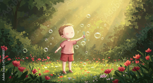 Adorable boy blowing soap bubbles in a magical sun-drenched forest