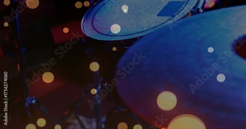 Showcasing drum kit bathing in warm bokeh lights on dim stage, with tom drum, cymbal, stands
