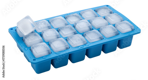 Blue silicone ice cube tray filled with frozen cubes and one removed for use