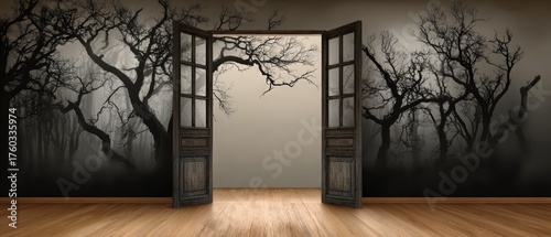 Open French Doors Leading to a Mystical Forest Scene with Shadowy Trees and Foggy Atmosphere in a Room