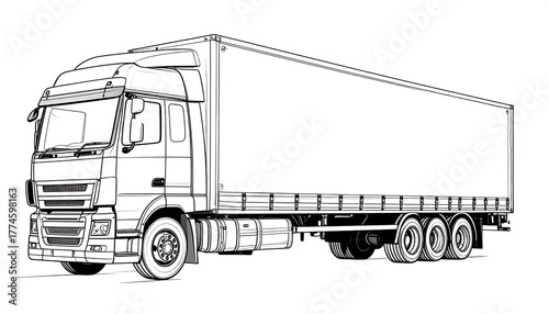 Line art illustration of a large articulated lorry, shown in profile, with a long trailer. The drawing style is clean, and rendered in black and white