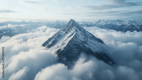 Snowcapped mountain peak rising above a sea of clouds in the alps