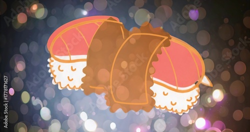 Floating two nigiri and one gunkan sushi piece across digital canvas with soft focus bokeh lights