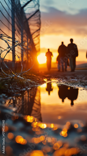 Silhouettes of people walking past a barbed wire fence at sunset, reflected in a puddle.