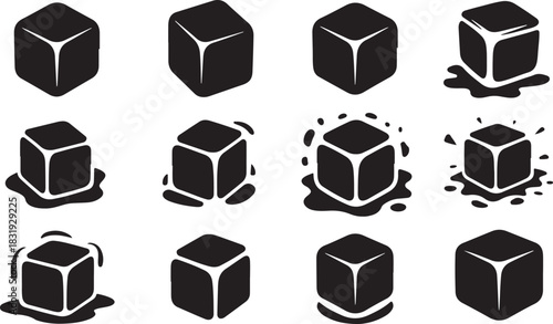 Black Ice Cubes Melting and Splashing on a White Background water