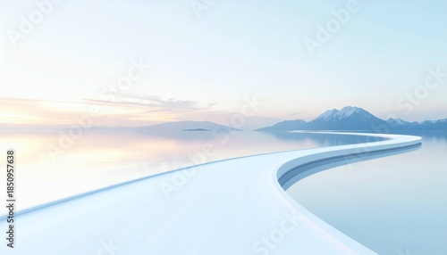 Serene winter landscape with a winding frozen lake shore and majestic mountains in the background under a calm sky with soft pastel hues.