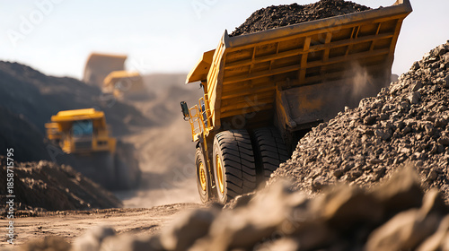 Heavy-duty trucks haul earth in a vast quarry under a bright sky, their massive tires kicking up dust. Powerful machines at work, transporting raw materials.