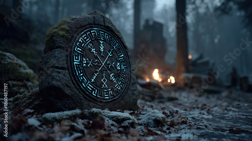 Mysterious viking rune stone surrounded by forest and mystical elements in a fantasy landscape