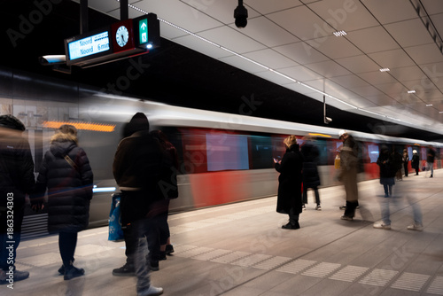 Commuters waiting on metro platform with motion blur. Rush hour metro station. Train moving.