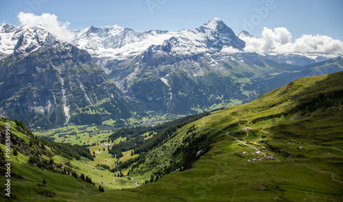 Majestic Swiss Alps Landscape with Green Valleys and Snow-Capped Peaks