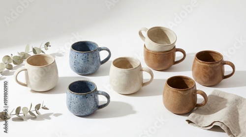 Collection of Artisan Handmade Ceramic Coffee Mugs in Earthy Blue, Cream, and Terracotta Tones, Minimalist Product Photography on White Background with Soft Shadows and Dried Eucalyptus Accents.