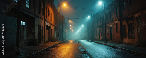 Dark urban street at night. Wet asphalt reflects orange and blue light from streetlamps. Buildings line the deserted road shrouded in fog, creating a mysterious, tense atmosphere.