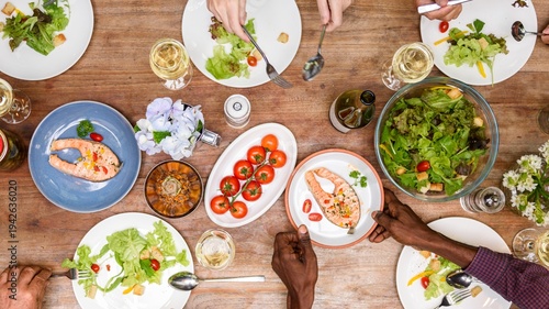 Top view of diverse hands enjoy lunch meal with salmon and salad, healthy food. Lunch menu, healthy salad and salmon on wood table, top view photo, diverse people hands enjoy lunch meal, sharing food