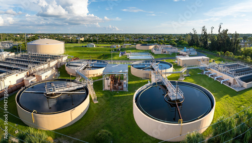 Large-scale industrial water treatment plant purifying and recycling water through filtration and chemical processes to meet health and safety standards