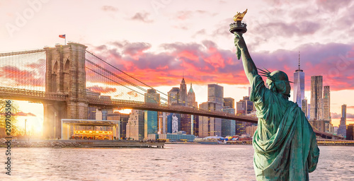 Statue Liberty and New York city skyline at sunset