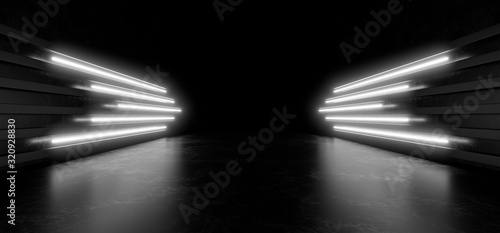 Beautiful composition of white neon lights on a black background. 3d rendering image.