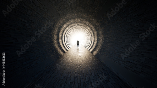 Concept or conceptual dark tunnel with a bright light at the end or exit as metaphor to success, faith, future or hope, a black silhouette of walking man to new opportunity or freedom 3d illustration