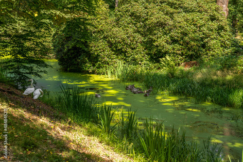 młode łabędzie pod okiem rodziców pożywiają się wśród przybrzeżnej roślinności