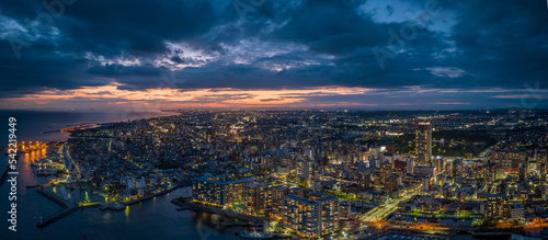 Panoramic aerial view of waterfront city at night with sunset afterglow