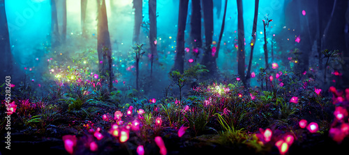 Abstract landscape. Colorful art fantasy landscape with a forest and glowing lights. Background illustration. Digital art image.