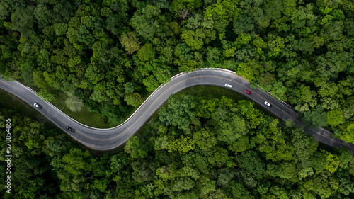 Aerial view green forest with car on the asphalt road, Car drive on the road in the middle of forest trees, Forest road going through forest with car.