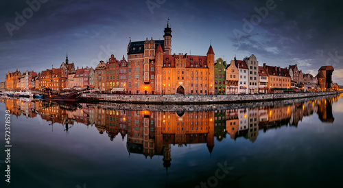 Gdańsk, Polska, port nocą, stare miasto, rzeka Motława, piękne domy, żuraw, podróż, wakacje, miasto zmierzch