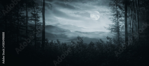 dark fantasy forest landscape at night with moon and clouds in the sky